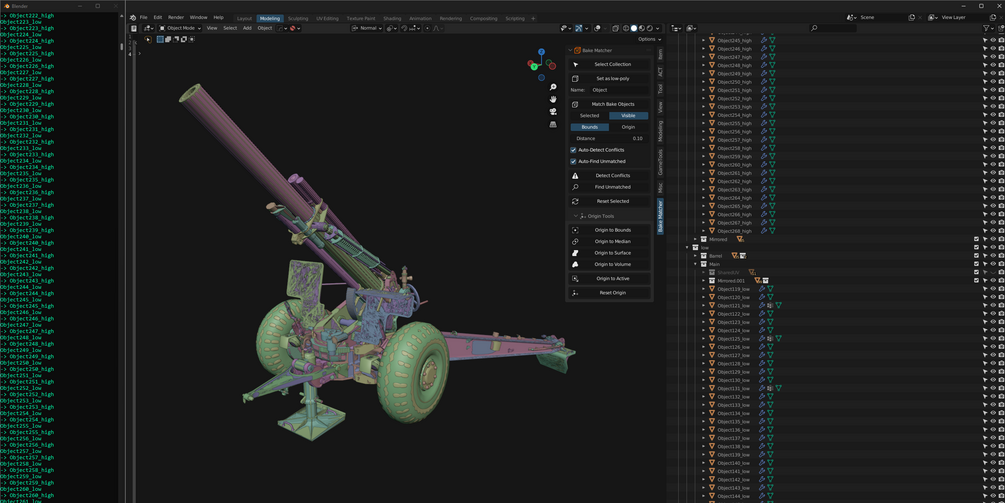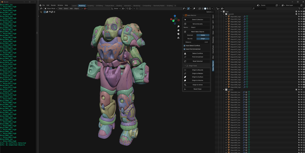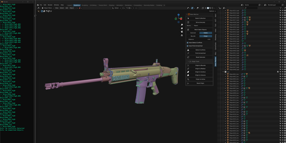 You can resolve conflicting low-poly objects by adjusting the Distance value or by adjusting the origin point positions for Origin Mode. This tool is intended to be used before Match Bake Objects, as it will avoid overlap in the matching process.